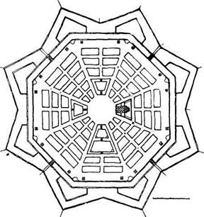 10. Даниель Спекле. Идеальный город; 1608 г. Последовательное использование радиальной планировочной системы