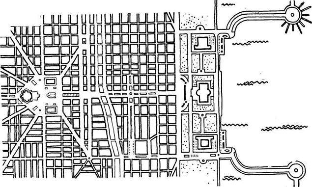Отчетливое влияние принципов «украшения города», французского академического урбанизма и «Эколь де боз'ар» проявилось и в Соединенных Штатах, причем не только в XVIII в. при закладке г. Вашингтона и некоторых других городов, но и в конце XIX в. Инициатором движения, лозунгом которого было City Beautiful — «прекрасный город», был архитектор Бернхэм*. Не случайно он создавал грандиозные перспективы композиционных осей и point de vue**, завершаемых монументальными классическими архитектурными сооружениями.