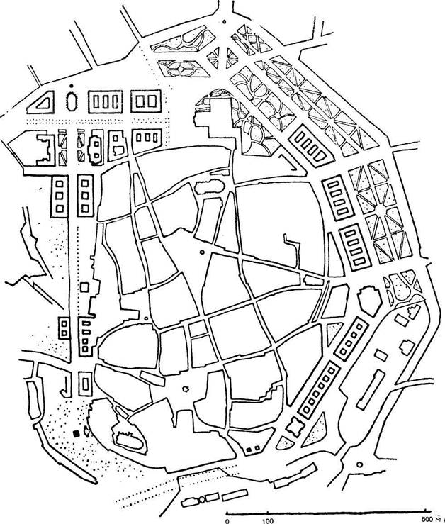 стройки других городов. Это работы по регулированию застройки, разбивка городских парков, посадка зеленых насаждений на старинных средневековых площадях, что, впрочем, имеет довольно спорную ценность. В отдельных случаях удачно в композиционном отношении размещались строившиеся тогда общественные здания. Эти крупные и менее значительные успехи требуют особой оценки, если иметь в виду те сложные условия, в которых они достигались. Это был период, характеризовавшийся не только чрезвычайно интенсивной урбанизацией, но также стремлением максимально использовать каждый гектар земли. Это был период, когда назревал один из самых больших переворотов в истории городов.