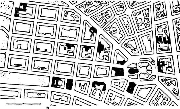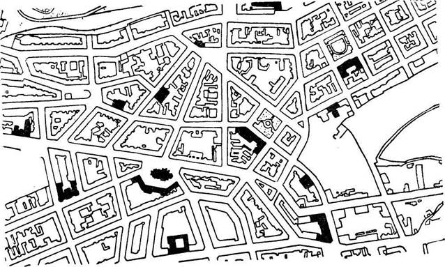 29. Прага - Винограды. Квартал, построенный по регулярному плану 1870 г. В общем решении видна как более отчетливая композиционная концепция, так и стремление создать общественное пространство, вокруг которого располагается целый ряд общественных зданий