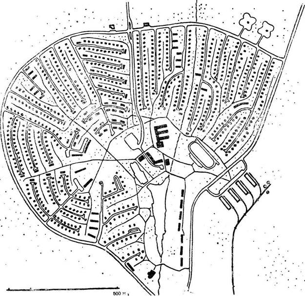 51. Школа В. Гропиуса и М. Вагнера. Оптимальный жилой массив на 5 тыс. жителей; 1943 г. В решении жилого комплекса особое внимание уделено отделению автомобильного транспорта от пешеходных путей. Переулки, обеспечивающие возможность подъезда к отдельным домам и одновременно препятствующие сквозному проезду транспорта, являются типичным признаком, в частности, американских «автомобильных» поселков