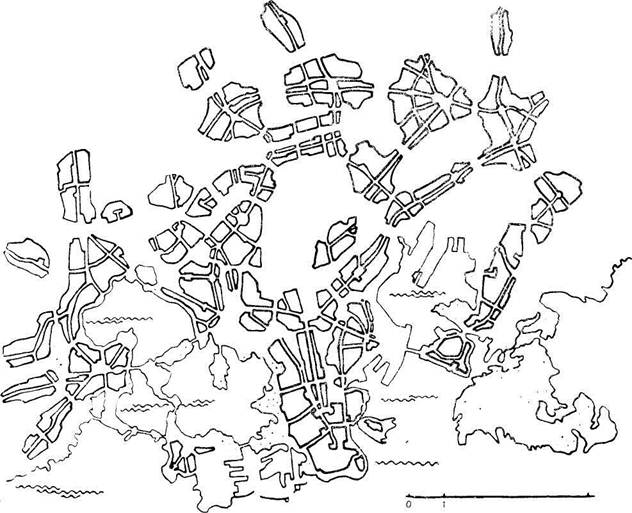 На первом же рисунке под изображением развалин современного города мы читаем: «Пусть рухнут воздвигнутые безобразия. Каменные дома рождают каменные сердца». На нижней половине страницы дан вид идиллической местности с равномерно расположенными небольшими домами поселков, планы которых имеют форму цветов. В орнамент рисунка вписаны слова: «Теперь наша земля расцветает...»10. Подобного рода изречения сопровождают рисунки, изображающие рабочие поселки на 500—600 жителей, системы нового расселения с коммуникациями и каналами, сельскохозяйственные колонии, общественные здания и т. п. Существом всей крайне дезурбанистической концепции является замена всего существующего расселения системой маленьких колоний, которые как бы разбредаются по земле, образуя рав-
