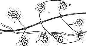 I — региональный административный и торговый центр; 2 — промышленные районы; 3 — жилые районы; ' — школьный и культурный центр; 5 — безостановочная основная транспортная магистраль