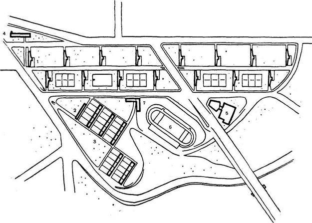 ■ — 15 домов-коммун, в каж-::ом по 300 жилых ячеек площадью 9,6 м2; 2 — павильон для детей до 6 месяцев; 3 — павильоны для детей до 6 лет; 4 — общественная кухня и теплоэлектростанция; 5 — культурный;: административный центр; '■ — стадион; 7 — медицинские учреждения
