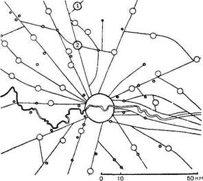 100. Пурдом. Проект системы, городов-спутников вокруг Лондона; 1922 г. В то время уже существовали Лечуорт (1) и Уэлвин (2)