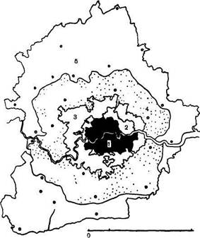 ! — административная территория лондонского графства (черный цвет); 2— внутреннее городское кпльц/): 3 — предместья; 4 — зеленый пояс; 5 — внешнее ландшафтное кольцо