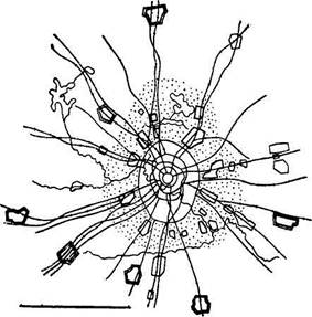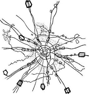 Неменьшее значение имело постановление Президиума Верховного Совета РСФСР о расширении границ Москвы и создании вокруг нее защитного лесо-паркового пояса (1960 г.). При утверждении генплана реконструкции в 1935 г. территория города составляла 28 500 га. а в 1960 г.— приблизительно 35 000 га. По новому решению территория города увеличивалась до 87 500 га. Эта площадь ограничивалась ныне уже построенной кольцевой автомобильной дорогой длиной 109 км. Кроме того, к городу было присоединено 180 тыс. га зеленого пояса, а это значит, что территория города в целом увеличилась почти з 8 раз. Нет необходимости особенно подчеркивать значение этого мероприятия. Достаточно вспомнить о тех трудностях, с которыми сталкиваются Париж, Лондон и другие крупные города, сжатые устаревшими административными границами. Вместе с расширением границ Москвы был сделан первый шаг к разработке нового генерального плана города, на