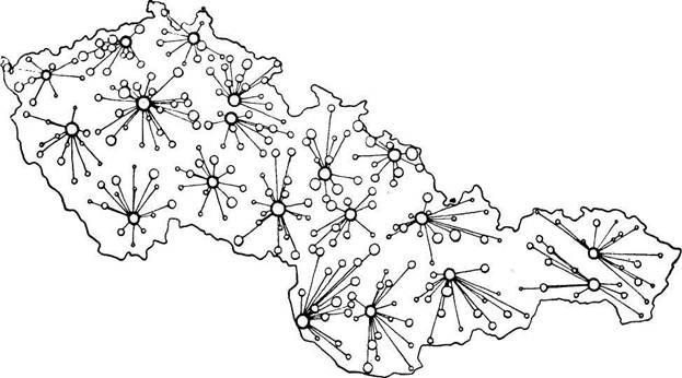 Второй ступенью можно обозначить центры настоящего и бывшего районного значения. В большинстве случаев центрами бывших районов считались практически все наши города, относящиеся к категориям различной величины. Там, где таких городов не было, центрами становились малые города (местечки) или же крупные села. Так, например, обстояло дело в Словакии. Сеть таких районных городов на территории ЧССР относительно густа и регулярна. Развитие в течение длительного периода содействовало их превращению в характерные центры нашего расселения. Здесь сосредоточивались административные и медицинские учреждения, учреждения культуры и учебные заведения, торговые центры и спортивные комплексы. Большинство таких городов превратилось в центры промышленного производства. У них была реальная возможность развить хорошую связь с селом, поскольку территория, управляемая ими, в большинстве случаев была наибольшей, создавая возможности для регулярных поездок.