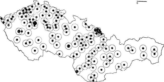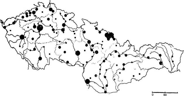 В соответствии с данными переписи 1961 г. по состоянию на 1 марта 12,6% населения ЧССР, т. е. свыше 1,7 млн. человек проживало в 6522 небольших населенных местах, насчитывающих до 500 жителей, 42,5% всего населения республики проживает в 10 917 населенных местах, насчитывающих менее 2 тыс. жителей. Такие населенные места составляют свыше 90% всех населенных мест. Из общего числа 11963 мест лишь 126 из них, т. е. в среднем 1% общего числа населенных мест, имеют более 10 тыс. человек. При этом под понятием населенное место имеется в виду административная единица, которая может дробиться еще на отдельные поселки, счет которых идет на десятки тысяч. При этом даже в небольших населенных местах основную часть населения образуют рабочие промышленных предприятий, живущие в селах и работающие в городе. Аналогичная рассредоточенность характерна и для самой промышленности. Так, исследования более раннего времени показали, что в каждом населенном месте на 1 тыс. жителей приходится как минимум одно промышленное предприятие.