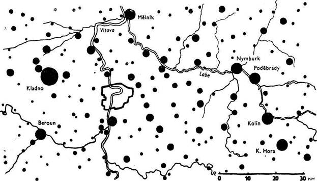 128. Расселение средней Чехии; 1961 г. Значительная разбросанность населенных пунктов, образующих несколько более четкие системы только вокруг Праги, Кладно и вдоль реки Лабе