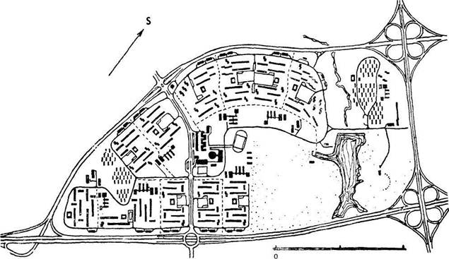 130. Зденек Хлуп и коллектив. Конкурсный про-гкт застройки экспериментального жилого района в Москве; 1960 г. Характерное современное решение с отчетливым членением на жилые группы по 1,5 тыс. и 6 тыс. жителей с соответствующими звеньями системы обслуживания