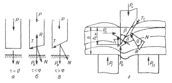 а - нормальное резание («рубка»); 6 - наклонное резание; в - скользящее резание; г - двухопорное резание.