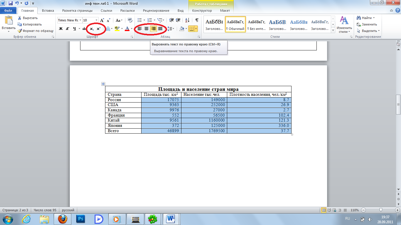 Для того чтобы выровнять текст в таблице по правому краю выделим нужный нам текст и нажмем соответствующую кнопку на панели инструментов во вкладке Главная. Чтобы при вводе использовать надстрочный и подстрочный знак так же нажимаем соответствующие кнопки на вкладке главная.