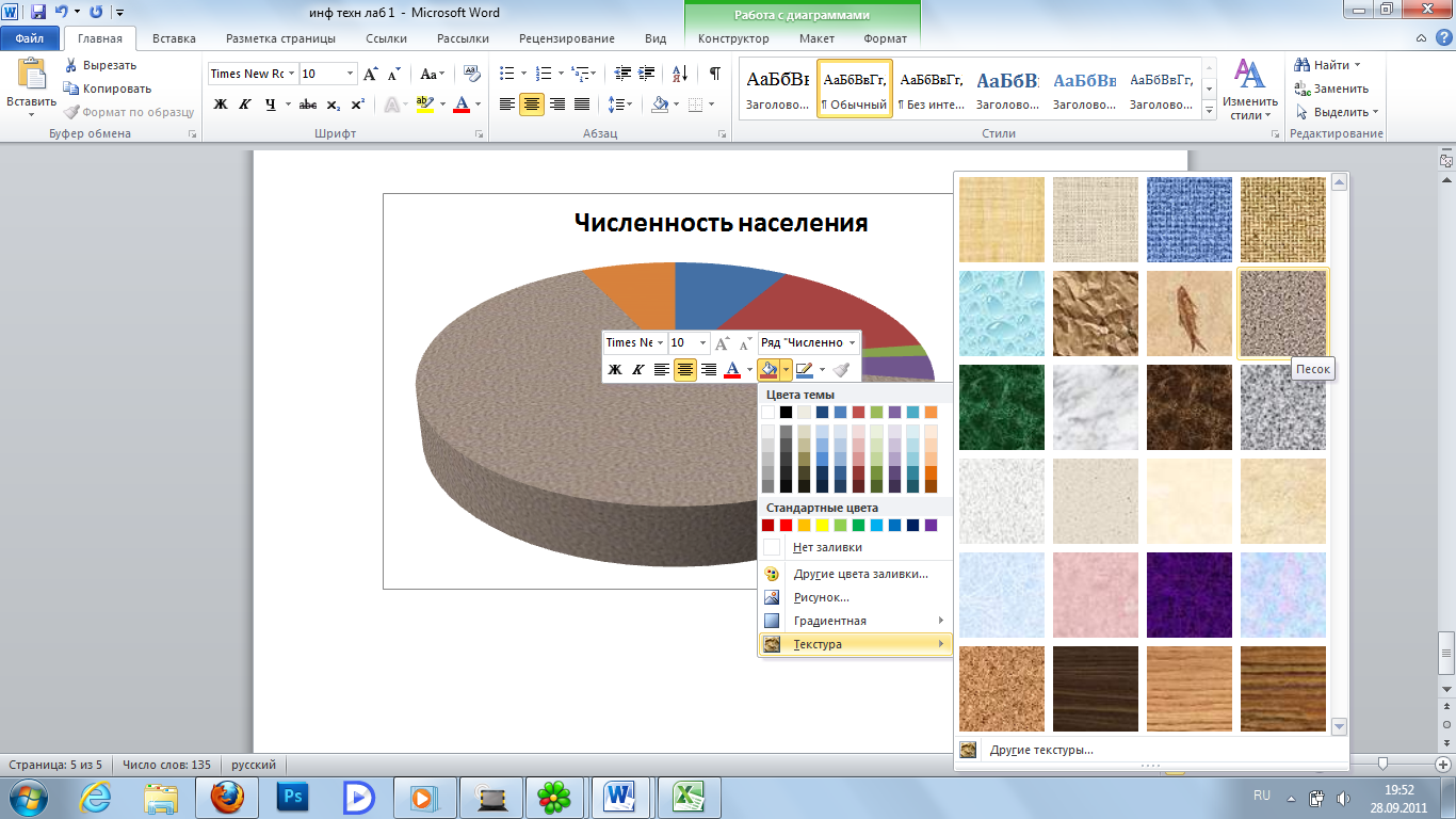 Чтобы использовать заливку в диаграмме выделяем нужный нам сектор щелчком левой кнопки мыши, затем нажимаем по выделенному сектору правой кнопой мыши, появляется меню в котором выбираем цвет заливки или текстуру.