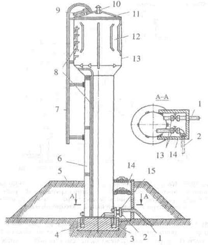 Рис.30. Конструктивная схема водонапорной металлической башни: 1 - напорно-разводящая труба; 2 - сливная труба; 3 - анкерные болты; 4 -фундамент; 5 - земляной вал (обсыпка); 6 - колонна; 7 - внешняя лестница; 8 - внутренние лестницы; 9 - люк; 10 - вентиляционная труба; 11 - крышка бака; 12 - удерживатели льда; 13 - бак; 14 - обзорный колодец; 15 - заслонка.