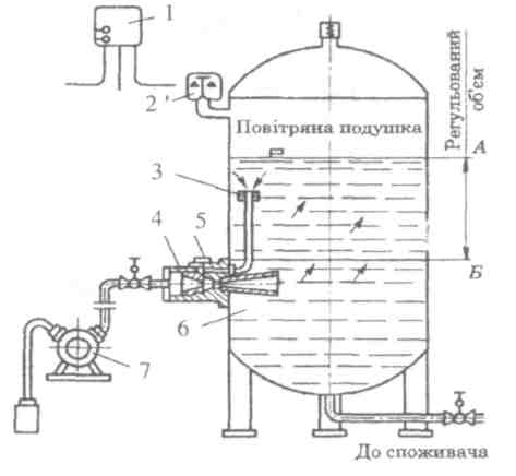 1 - станция управления; 2 – реле давления; 3 - жиклер; 4 - воздушный клапан; 5 - регулятор струи; 6 - воздушно-водяной бак; 7 - вихревой насос.