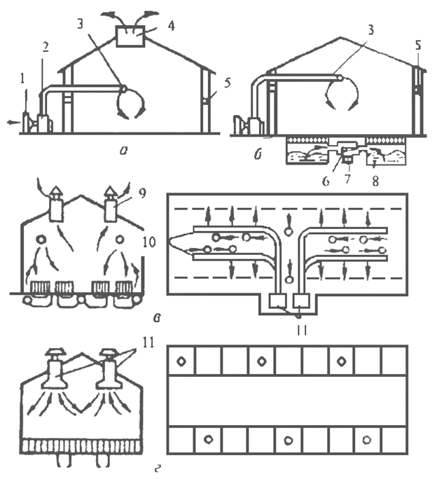 а - снизу вверх; б - сверху вниз; в - кольцевая; г - сверху вверх; 1 вытяжные каналы; 11 - вентиляционно - отопительные установки.- калорифер; 2 - приточный вентилятор; 3 - воздухопровод; 4 - вытяжная шахта; 5 - окно; 6 - навозный канал; 7 - вытяжной вентилятор; 8 - воздухопровод системы вытяжки; 9 - вытяжная шахта с вентилятором; 10 - оконные проемы.