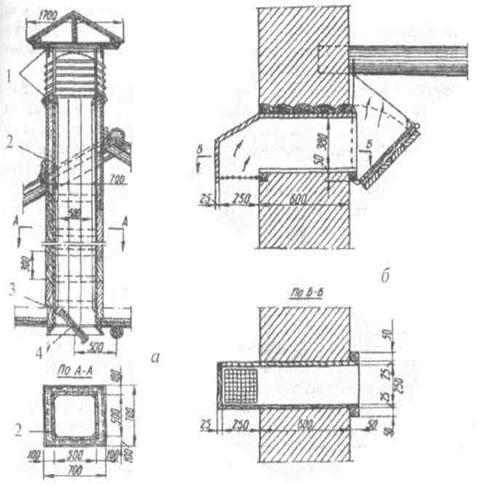 а - вытяжная труба; б - приточный канал; 1 - дефлектор; 2 - короб канала; 3 - теплоизоляция; 4 – заслонка.