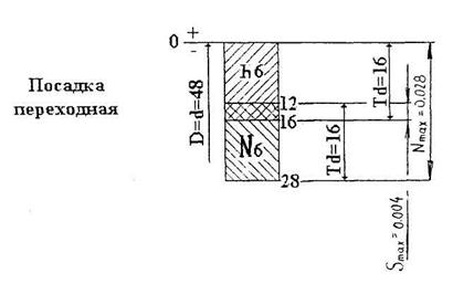 Строим схему расположения полей допусков и определяем вид посадки. Так как поля допусков вала и отверстия перекрываются, следовательно, рассматриваемая посадка - переходная.
