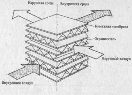 Для фольговых теплообменников (рис.54) наиболее благоприятным может быть перекрестно-поточный теплообмен, однако при этом необходимо, чтобы на обеих поверхностях теплообменника было одинаковое давление. Это связано с тем, что фольга, натянутая на деревянный каркас, не выдерживает большого поверхностного давления. Поток воздуха вдоль обеих поверхностей фольгового теплообменника заставляет вибрировать натянутую фольгу так, что попадающая на ее поверхность пыль не может прилипнуть и с потоком воздуха попадает в нижнюю часть устройства, где оседает. Если не обращать внимания на повышенные требования к используемой фольге, то это устройство простое и имеет высокую эффективность. Об использовании его в Венгрии у нас сведений нет.
