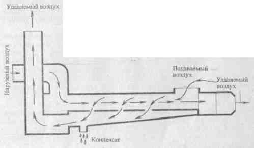 Большинство теплообменников перекрестно-поточные, хотя имеются также и чисто противоточные (рис. 53). В животноводческих помещениях применяются теплообменники как типа воздух-воздух, так и типа воздух-жидкость. Вследствие запыленности воздуха животноводческих помещений только те типы теплообменников имеют право на существование в животноводстве, очистка которых проста.