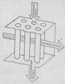Теплообменники из пучков труб применяют при использовании сред воздух-воздух и воздух-жидкость. Первый тип теплообменников, который исследовался в животноводстве (Швейцария, 1950), был создан из стеклянных труб. Удаляемый из животноводческого помещения воздух протекал по наружной поверхности пучка труб, а приточный воздух - по внутренней (рис. 55). Загрязнения удаляемого из помещения воздуха откладываются на наружной поверхности труб, откуда их обычно смывают водой. Очистка производится автоматическим моющим устройством по определенной программе. Стеклянно-трубочные теплообменники (вследствие перекрестно-поточного теплообмена имеют высокую эффективность (Ф=0,4-0,7), но стоимость их довольно высока.