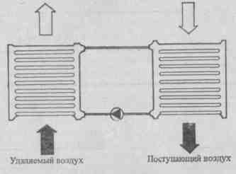 В пластмассовотрубочных теплообменниках теплообмен происходит с участием передающей среды, обычно воды, а в таких местностях, где необходимо считаться с морозами, морозостойкой жидкости. Эти системы обычно состоят из двух теплообменников (рис. 56), так как при теплопринимающих и теплоотдающих средах необходимо использовать по одному такому устройству. Пластмассовая трубка часто применяется в качестве теплообменника (рис. 57) и в зависимости от условий может даже представлять собой смонтированный в плоскости трубочный радиатор. У одного из теплообменников передающей средой является воздух, а у другого в зависимости от устройства может быть и жидкость. Иногда принимающая тепло сторона теплоприемника располагается в почве или навозе или используется как солнечный коллектор. Пластмассовотрубочные теплообменники применяются и в различных типах тепловых насосов. Кроме пластмассово- и стеклянно-трубочных теплообменников для возврата тепла через передающие среды могут применяться и другие материалы, однако вследствие трудности очистки и агрессивности сред, участвующих в теплообмене, не все материалы пригодны для этих целей.
