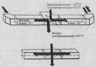 Регенеративные теплообменники с двигающейся насадкой могут иметь круговое или поступательное движение насадки. В регенераторах с круговым движением насадки (или ротационных) (рис.58) удаляемый (отдающий тепло) или наружный (принимающий тепло) воздух движется в противоположных направлениях через теплоаккумулирующую насадку (рис. 68) пока она вращается. Теплоаккумулирующая насадка при прохождении через нее отдающего тепло воздуха нагревается и, поворачиваясь, нагревает поступающий наружный воздух. Насадка может быть расположена в определенном месте или произвольно. Преимущество правильно расположенной насадки в том, что частицы пыли из обработанного воздуха застревают в начале микроканальцев и в момент поворота наружный воздух выдувает их обратно. Вследствие образования в микроканальцах ламинарного потока величина теплопередачи незначительна, но зато площадь, на которой происходит этот процесс, большая. В случае неправильного расположения насадки наблюдается противоположная картина. Существуют и такие ротационные регенераторы, которые могут возвращать и скрытое тепло. В животноводческих помещениях существует опасность замерзания теплообменника. Из воздуха, удаляемого из животноводческого помещения, в насадке конденсируется влага, которая в холодные зимние дни может замерзнуть. С этим можно бороться с помощью обратного перемешивания, однако при этом уменьшается количество возвращаемого тепла.