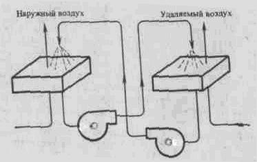 В жидкостных теплообменниках насадка, или наполнитель, так же, как и в других регенераторах, попеременно соприкасается с разными воздушными потоками (с удаляемым и приточным воздухом), однако в этих системах они не аккумулируют энергию. Наполнителем жидкостных теплообменников, имеющих замкнутый контур (рис. 60), обычно служит жидкость с абсорбентными свойствами (так как в этих случаях может быть возвращено и скрытое тепло), но им может быть и другая жидкость. Применение таких устройств в животноводстве было бы выгодно не только с точки зрения возврата тепла, но также и для уменьшения неприятных запахов в помещениях и в целях охлаждения летом.