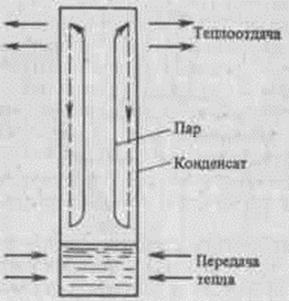 Тепловой сифон (рис. 61) представляет собой трубку с жидкостью в нижней части, а из пространства, которое находится над жидкостью, удален воздух. Если к жидкости в нижней части сифона подведем тепло, она испарится и сконденсируется в верхней части трубы с отдачей тепла. Конденсат обратно стекает в нижнюю часть по наружной поверхности трубы.