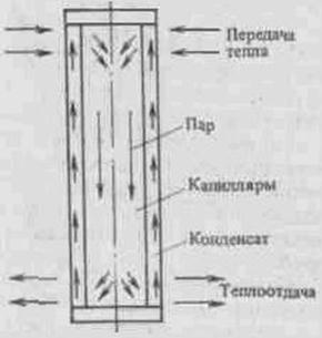 Тепловая труба от теплового сифона отличается тем, что конденсат попадает в нижнюю часть не под действием силы тяжести, а под действием капиллярных сил (рис. 62). Тепловой сифон можно применять только в том случае, если испаритель находится в самой нижней точке трубы, в то время как для тепловой трубы такого ограничения не существует. Устройство сифона проще, однако области его применения более ограниченны.