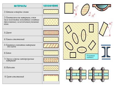 Hа чеpтеже сечения выделяют штpиховкой. Вид ее зависит от гpафического обозначения матеpиала детали и должен соответствовать ГОСТ 2.306 - 68* (pис. 9.1).
