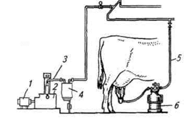 1 - электрический двигатель; 2 - вакуум-насос; 3 и 5 - вакуум-трубопроводы; 4 - вакуум-баллон; 6 - доильный аппарат.