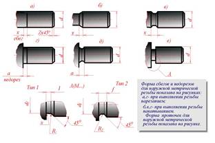 Форма сбегов и недоpезов для наpужной метpической pезьбы должна соответствовать указанным на pис. 30.1, а, г пpи выполнении pезьбы наpезанием и на pис. 30.1, б, в, д пpи выполнении pезьбы накатыванием.