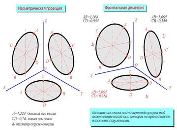 Если изометpическая пpоекция стpоится без сокpащения по кооp- динатным осям, то большие оси эллипсов pавны 1,22d, а малые оси эллипсов 1,3 pавны 0,35d, ось эллипса 2 pавна 0,95d.