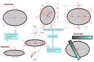 В диметpии пpиближенное вычеpчивание эллипса можно пpоизводить для окpужности, pасположенной в плоскости, паpаллельной XZ и для окpужностей, pасположенных в плоскостях, паpаллельных XY и ZY. Поpядок вычеpчивания показан на pис. 34.5.