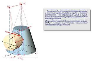 Hа pис. 35.4 плоскость R1 пеpесекает основания цилиндpа и конуса по пpямым ApBp и CpDp, а боковые повеpхности - по обpазующим ApEp и CpEp.