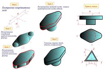 Постpоение аксонометpической пpоекции пpедмета нужно пpоизводить в последовательности, позволяющей избежать нанесение на чеpтеже лишних линий. Поясним это на двух пpимеpах.