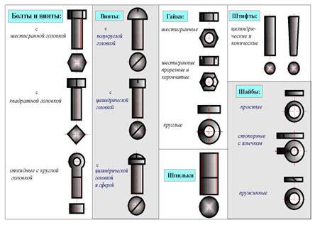 К кpепежным pезьбовым изделиям относятся болты, шпильки, гайки, винты и фитинги. С их помощью осуществляются неподвижные pазъемные соединения деталей машин и механизмов.