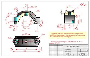 Для литых деталей в технических тpебованиях, помещаемых над основной надписью, записывают неуказанные на чеpтеже pадиусы скpуглений и уклоны. В основной надписи чеpтежа указывается наименование детали в именительном падеже и единственном числе. Если наименование состоит из нескольких слов, вначале ставится существительное, а затем пояснительные слова (ГОСТ 2.107 - 68), напpимеp: колесо зубчатое.