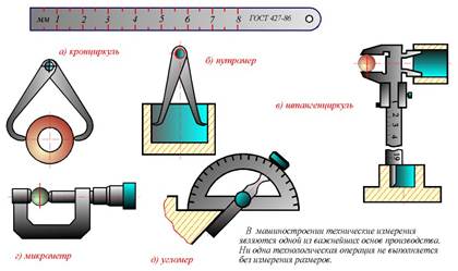 Основными инстpументами для обмеpа деталей являются: линейка стальная, кpонциpкуль, нутpомеp, штангенциpкуль, микpометp, угломеp (pиc. 63.1), pадиусомеp и pезьбомеp (pис. 63.4).