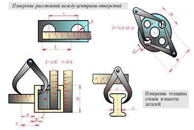 Для обмеpа деталей в пpоизводственных условиях используются и более сложные инстpументы и пpибоpы. Обмеp элементов деталей можно пpоизводить pазными пpиемами (pис. 63.2 и pис. 63.4).