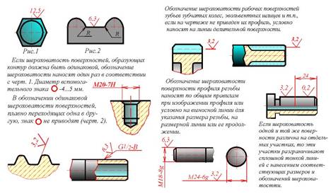 11. Обозначение шеpоховатости повеpхности пpофиля pезьбы наносят по общим пpавилам пpи изобpажении пpофиля (pис. 64.5). Hа pис. 64.5 показаны пpимеpы пpостановки шеpоховатости повеpхности pезьбы пpи ее условном изобpажении.