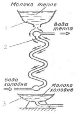 На рис. 69 изображена схема работы оросительного охладителя в соответствии с которой молоко подается в верхний желоб 1 и оттуда самотеком стекает с обеих сторон охлаждающей поверхности 2 в нижний желоб 3. В этом случае применяется противоточный принцип. Молоко перемещается сверху вниз, а охлажденная вода наоборот - снизу вверх.