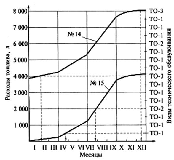 По оси абсцисс строят шкалу времени (месяцы года), а по оси ординат — шкалу расхода топлива и шкалу периодичности ТО. Начало кривой соответствует расходу топлива данным трактором на 1 января планируемого года от начала эксплуатации или капитального ремонта. Например, трактор № 14 израсходовал от начала эксплуатации 3800 л топлива, а трактор № 15, введенный в эксплуатацию — 0 л.