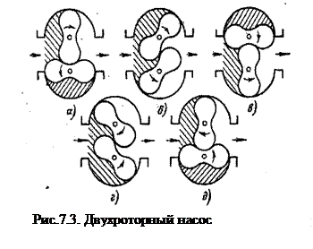 В цилиндрической камере 1 (рис. 7.2) вращается эксцентрик 2 с надетым на него плунжером 3. Газ из откачиваемого объема поступает в полость всасывания через окно 5 в прямоугольной части плунжера, который скользит в направляющей 6 в свободно поворачивающемся гнезде корпуса, при повороте эксцентрика 2 на некоторый угол от верхнего положения (а). Окно 5 в прямоугольной части плунжера выходит из направляющей вниз (б), полость всасывания соединяется с впускным патрубком насоса и газ поступает в полость всасывания (а), непрерывно увеличивая свой объем, пока окно 5 не будет снова прикрыто (г). Одновременно в полости сжатия происходит два процесса: сжатие и выталкивание газа через выхлопной клапан 4.