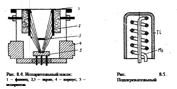 На рис. 8.5 представлена конструктивная схема подогревательного испарителя. Он представляет собой оболочку в виде сферы из активного металла (титан), внутри которого вставлен проволочный нагреватель из молибдена. Температура оболочки составляет 11500С, при этом максимальная скорость испарения титана 1 мг/с. Титан образует прочные нелетучие соединения почти со всеми газами за исключением инертных и углеводородов. Поэтому применение испарительных насосов неэффективно при откачке органических соединений и инертных газов.