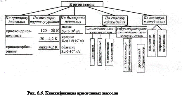 Несмотря на большое многообразие крионасосов, их можно разделить по следующим основным признакам: по принципу действия, температурному уровню криопанели, быстроте откачки, способу охлаждения криопанели и конструктивной схеме. На рис.8.6 представлена классификационная схема криогенных насосов.