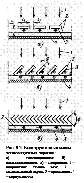 Наиболее типичные конфигурации экранов и их расположение показаны на рис. 9.3. Для этих конфигураций экранов в таблице 9.1 приведены значения вероятности пролета молекул через них и коэффициента передаваемой на криопанель мощности излучения.
