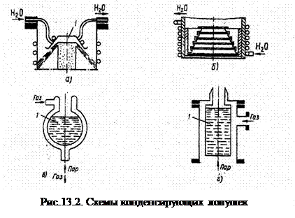 В охлаждаемых стеклянных и металлических ловушках (рис. 13.2, в, г) отражение и конденсация паров рабочей жидкости происходит на поверхностях, охлаждаемых до низких температур. Минимальная величина обратного потока составляет 6,9·10-6 м3 /(см2 · с).